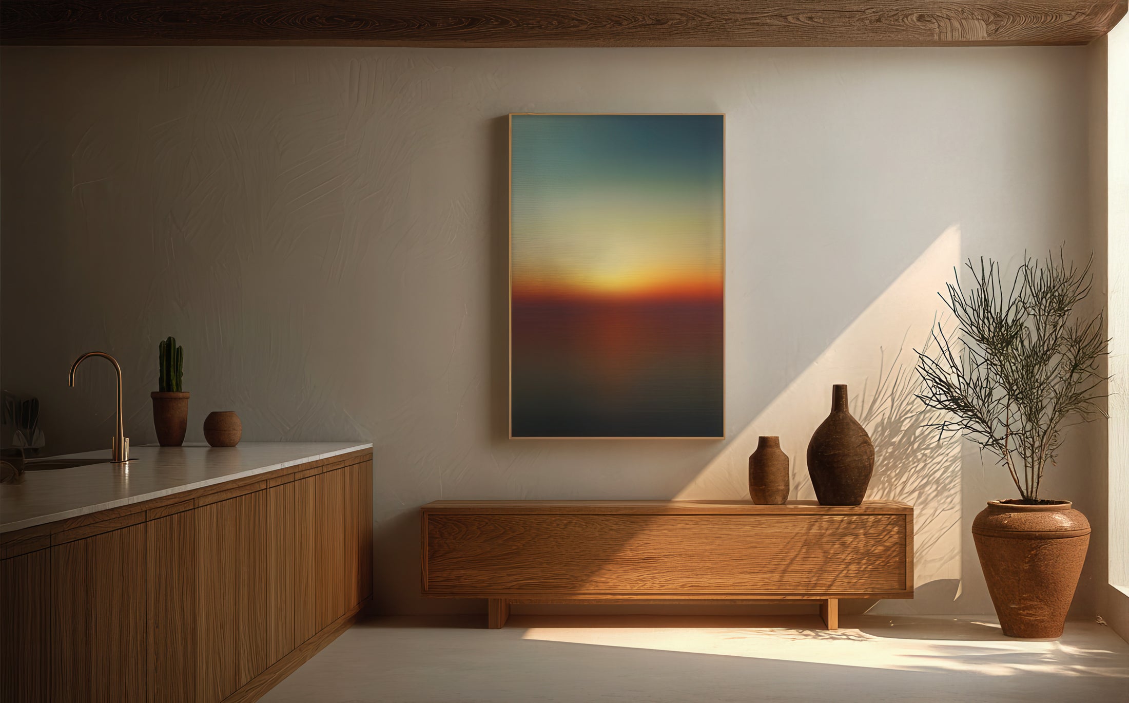 Frameless artworks use a discreet floating plate system for a clean hovering effect on your wall.