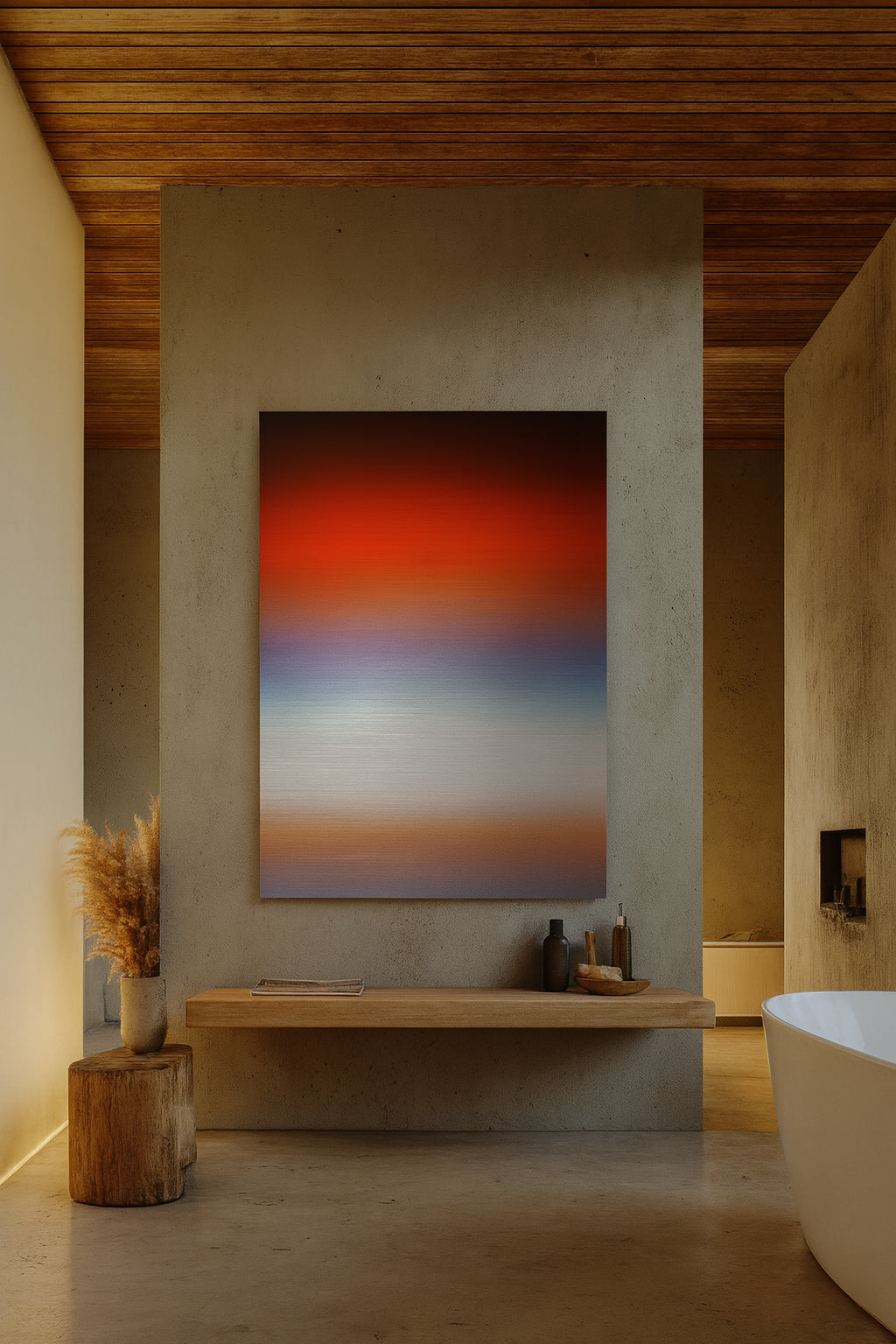 Flarebound is a vibrant artwork that moves through bands of fiery red, violet haze and cool silver light. Printed on brushed aluminium, the colours shift softly throughout the day, creating subtle movement and a luminous, atmospheric presence.