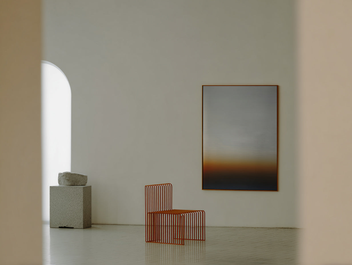 Solenne introduces a quiet, contemplative atmosphere through deep neutrals and warm tonal shifts. Printed on brushed aluminium, the piece responds subtly to changing daylight, creating a calm, evolving presence throughout the day.